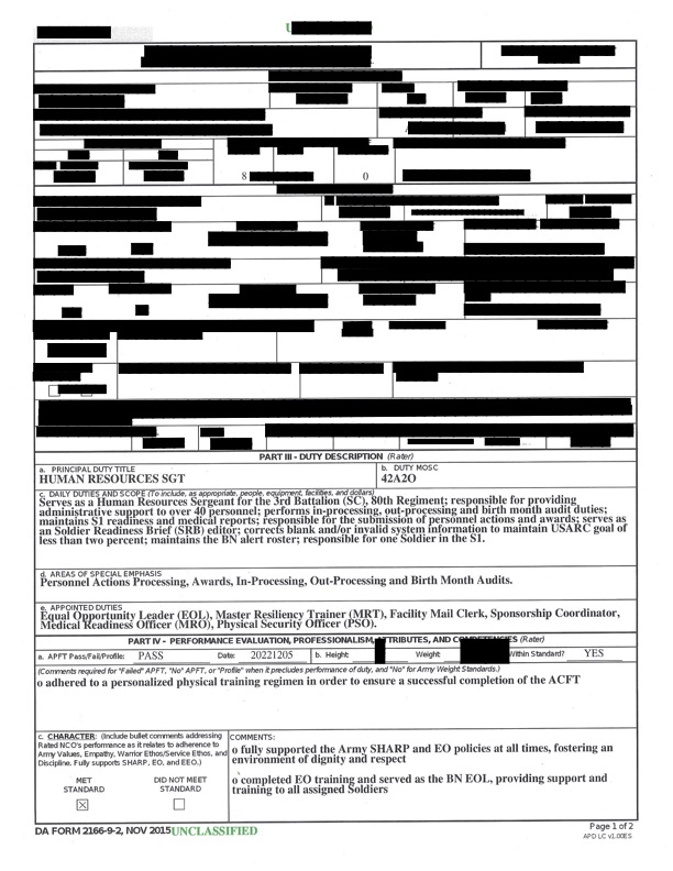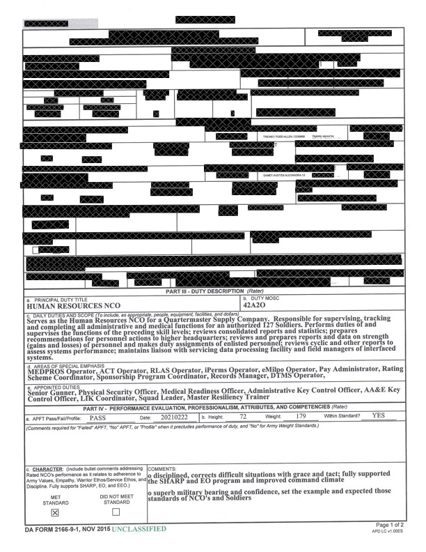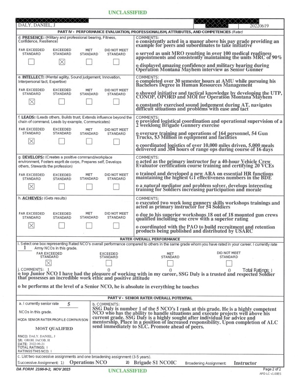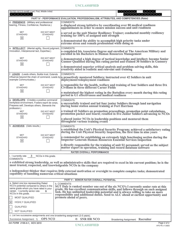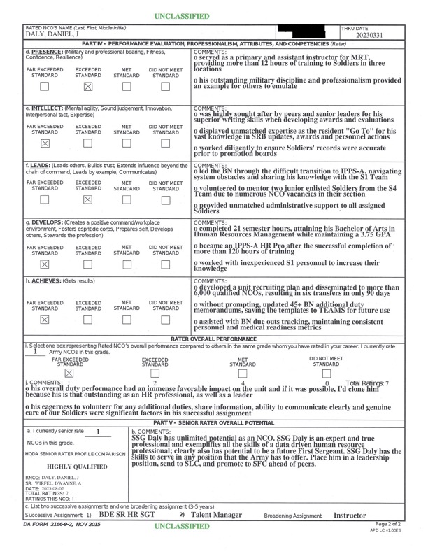 “SSG Daly has unlimited potential as an NCO. SSG Daly is an expert and true professional and exemplifies all the skills of a data driven Human Resources professional”