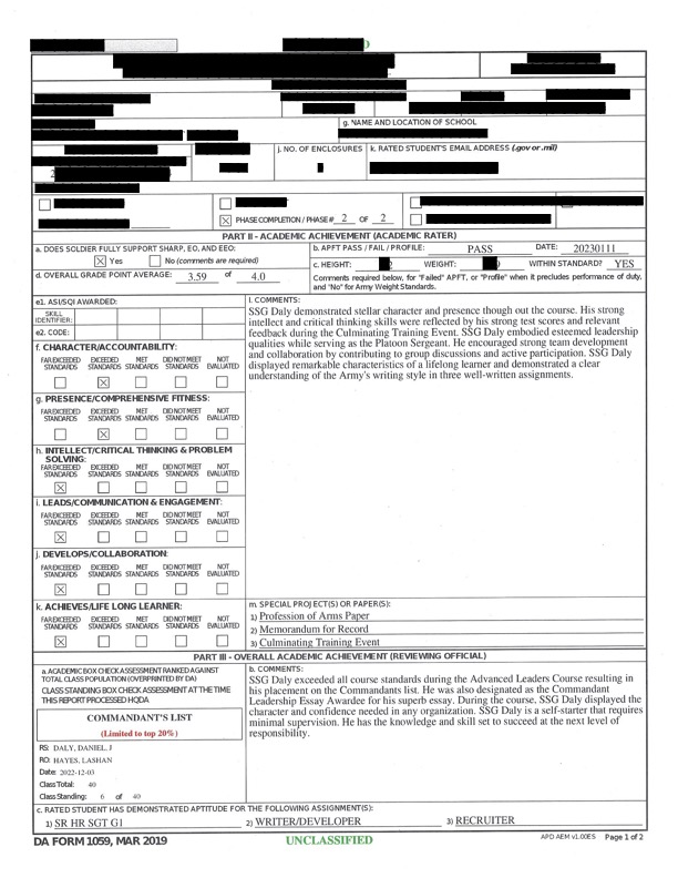 “SSG Daly displayed the character and confidence needed in any organization. He is a self-starter that requires minimal supervision. He has the knowledge and skill to succeed at the next higher level of responsibility”